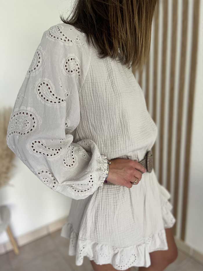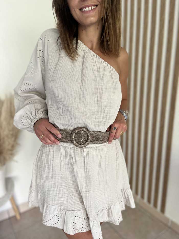 Combinaison short avec jupe, une manche longue avec motif gouttes d’eau, un bras dénudé, élastique au niveau du buste et un élastique au niveau de la taille. Elle est en gaz de coton, de couleur beige.