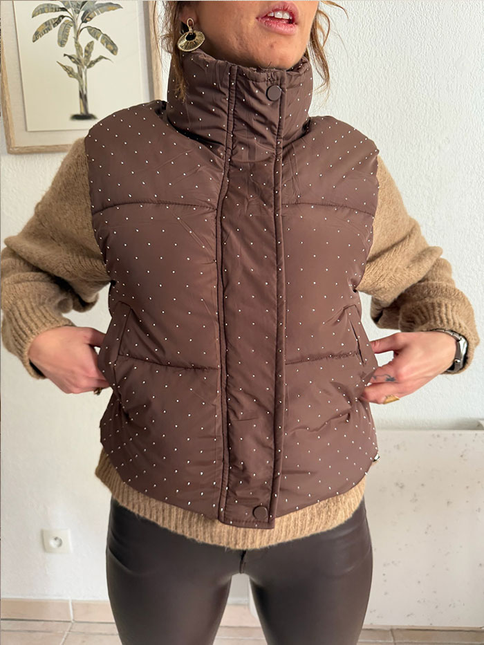 La doudoune sans manche Flavie est la doudoune incontournable. Sa couleur chocolat et ses strass viennent donner un look chic et brillant à votre tenue, Collection Glitter.