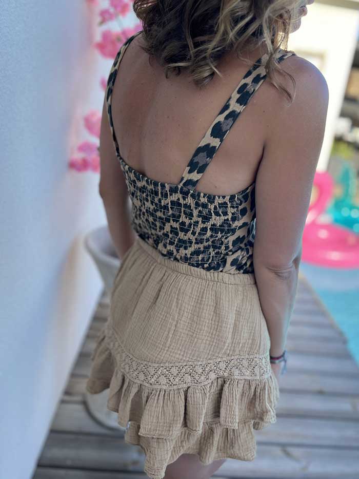 Jupe avec short, de couleur camel, en gaz de coton. Elastique à la taille, broderie, et volants.