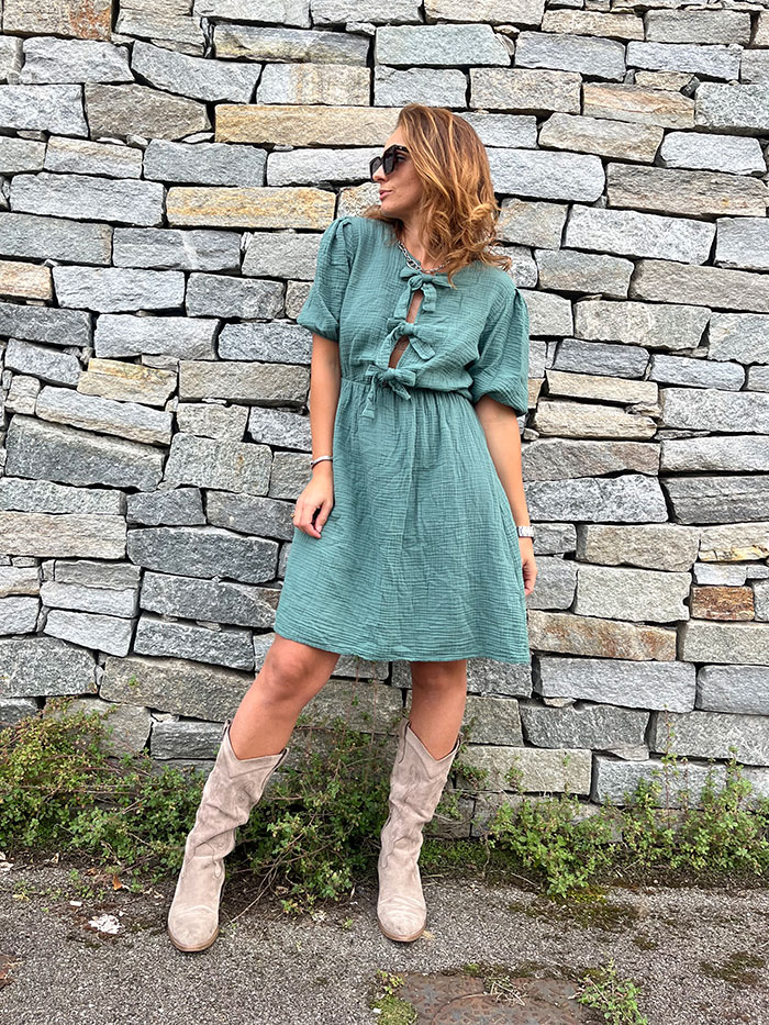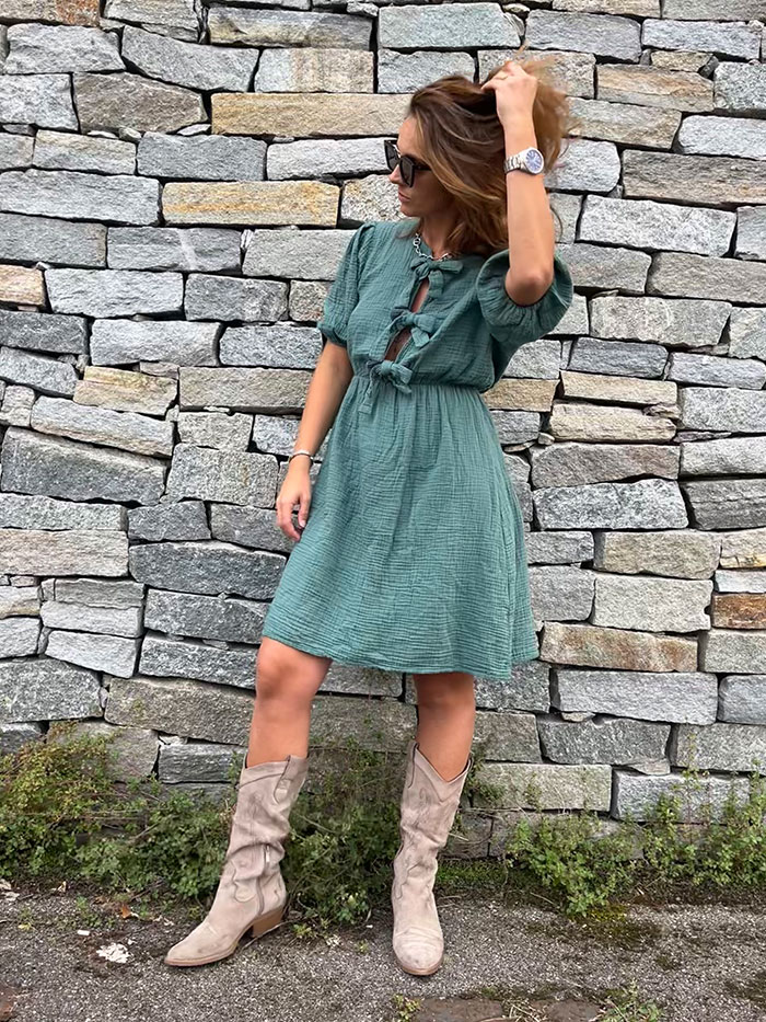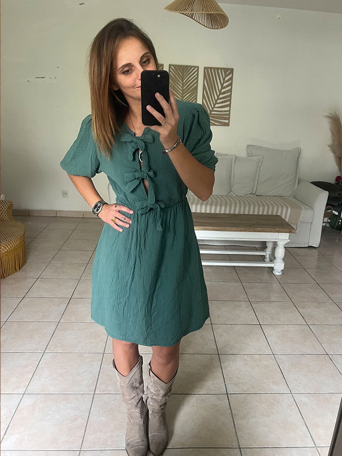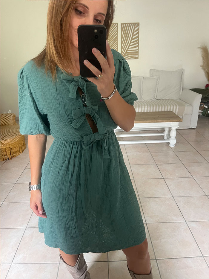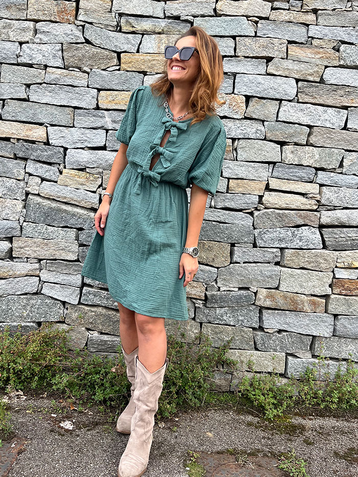 La robe Eléne , est une robe en gaz de coton , elle est idéale en toutes saisons. Avec ses manches mi-longues et ses 3 noeuds devant, elle donne un look tendance et casual.