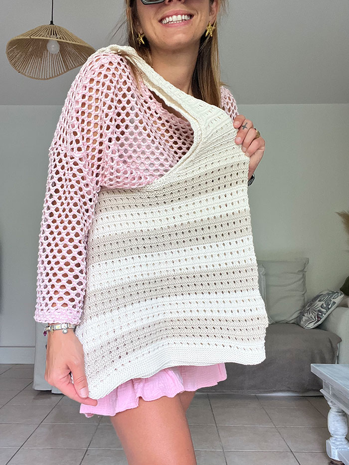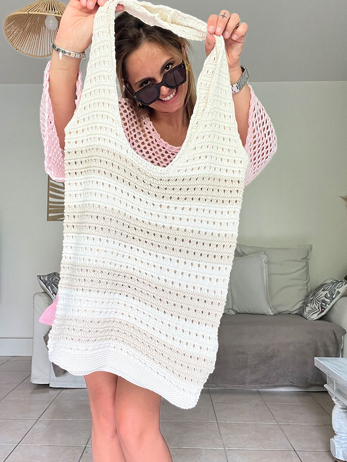Le sac Laly beige et écru, est un sac en mail à rayure. il est idéal pour le quotidien, la plage ou encore aller au au marché.