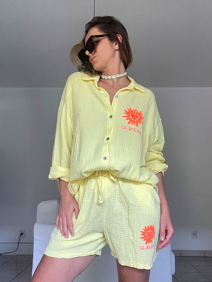 Le Short Soleil est brodé avec élégance d’un petit soleil orange. Il est en gaz de coton, agréable à porter en toutes circonstances.